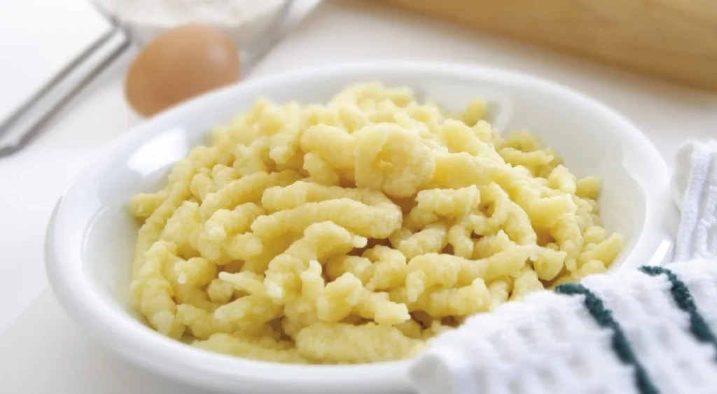 1. Etwa 2l Wasser zum Kochen bringen. Den Teig portionsweise auf das Spätzlesieb geben und durch Hin- und Her- Bewegungen ins sprudelnd kochende Wasser pressen.